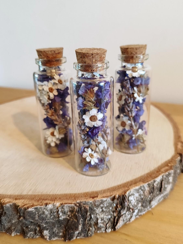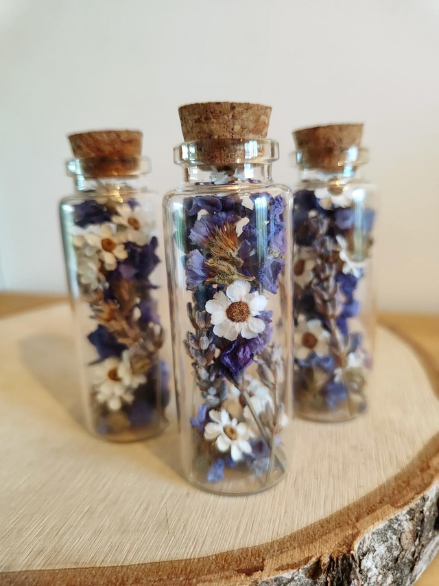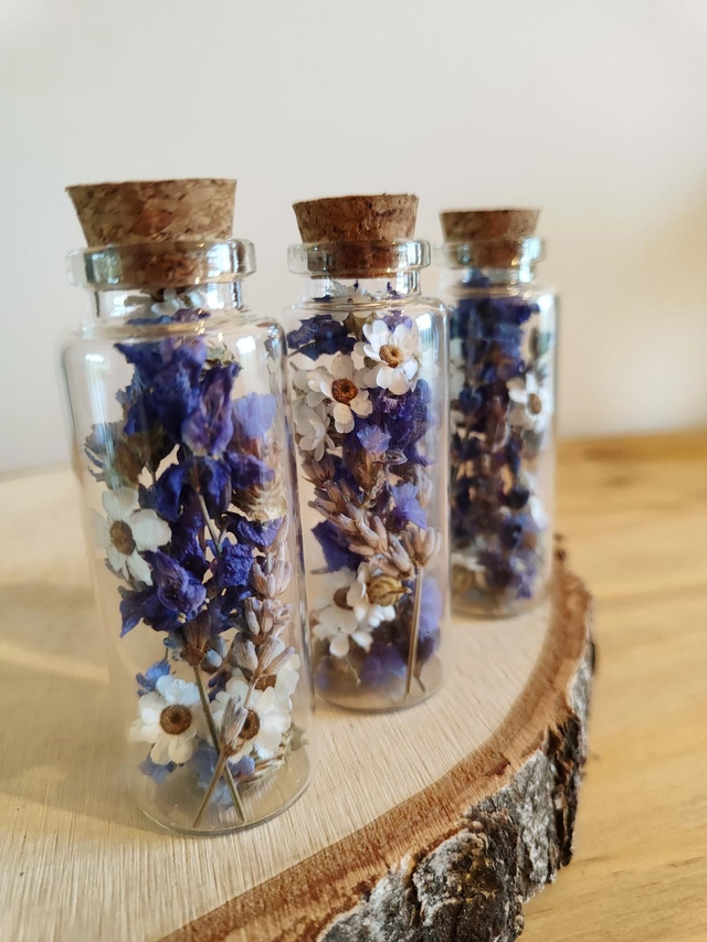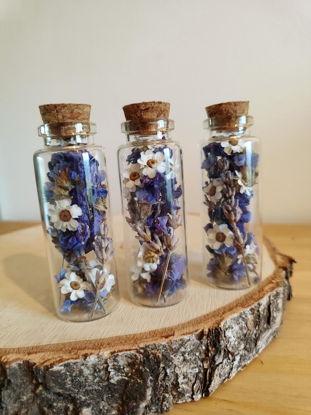 Besoin d'un petit coup de boost anti-morosité ? C'est tout trouvé, avec ce trio de fioles fleuries, vous disposerez d'un antidote floral, remède anti-grisaille garanti ! Chaque fiole est remplie à la main dans mon atelier, avec des fleurs séchées minutieusement choisies.