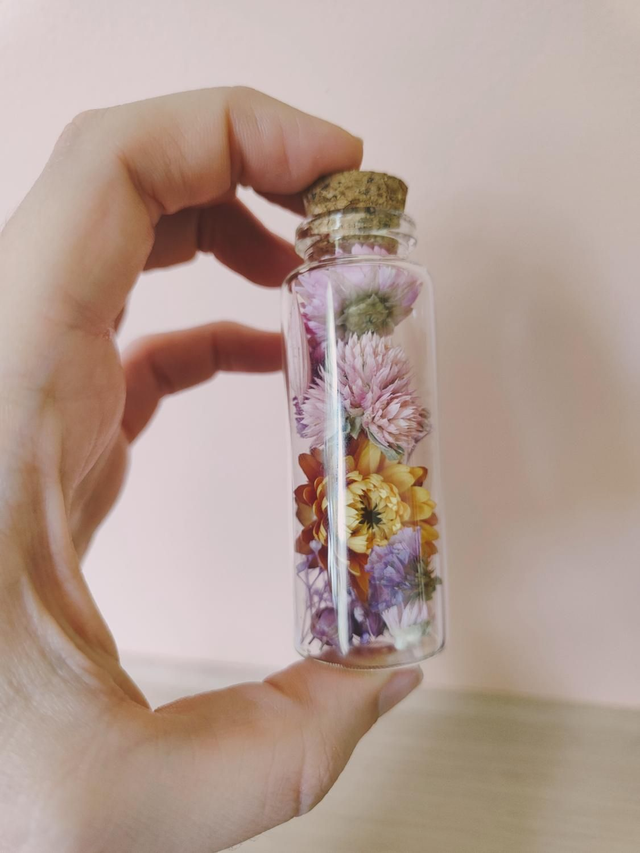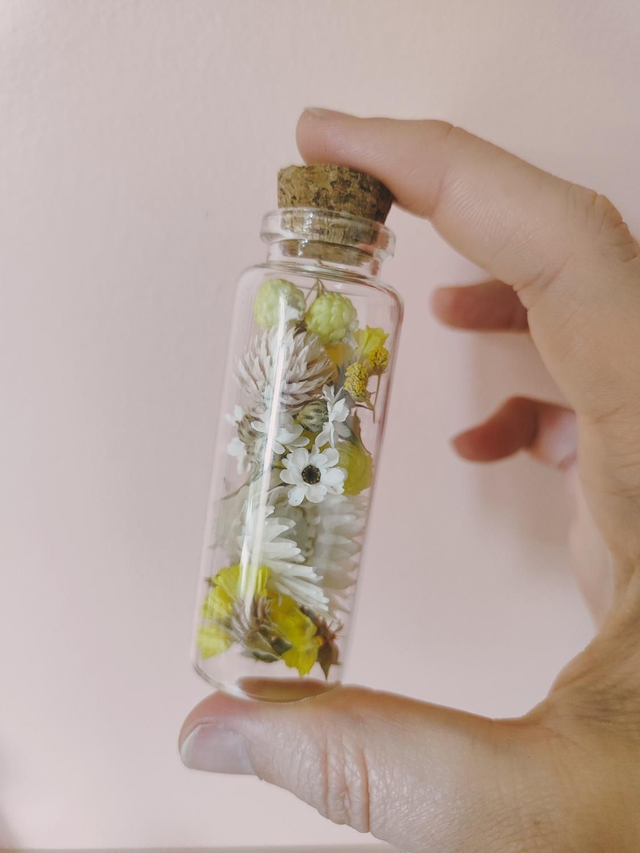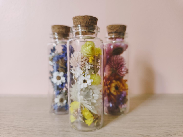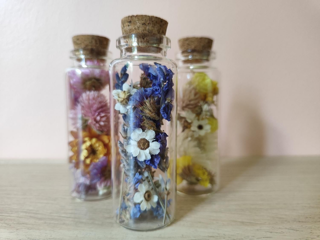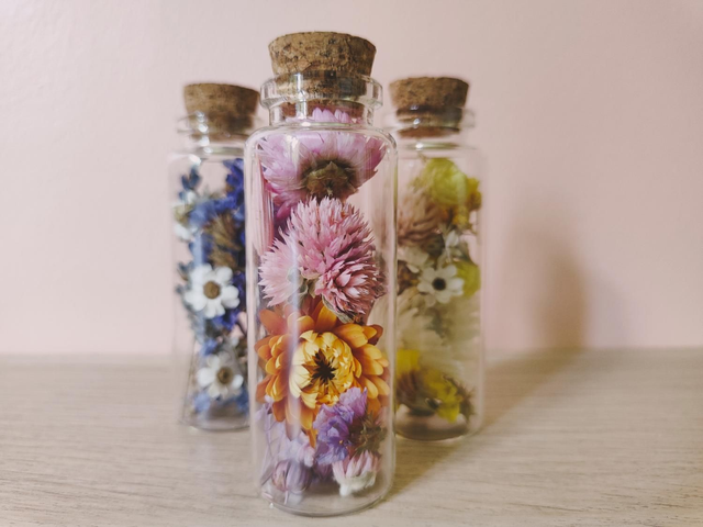 Besoin d'un petit coup de boost anti-morosité ? C'est tout trouvé, avec ce trio de fioles fleuries, vous disposerez d'un antidote floral, remède anti-grisaille garanti ! Chaque fiole est remplie à la main dans mon atelier, avec des fleurs séchées minutieusement choisies.