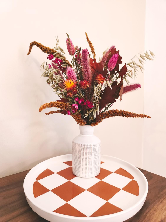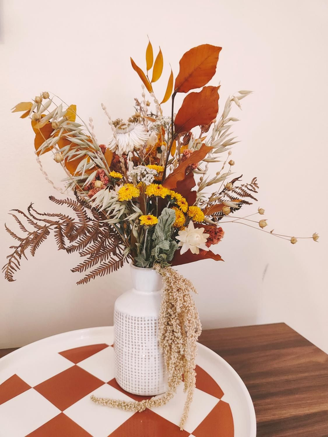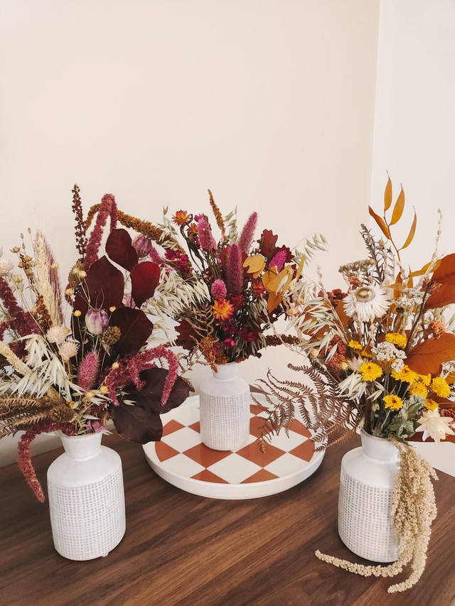Chaque vase fleuri est une création unique, composée d'un vase en céramique et d'un bouquet confectionné à la main avec des fleurs séchées aux teintes automnales :