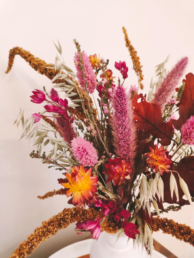 - Vase fleuri fuchsia & orangé "Sabrina" : amaranthe hot biscuit, penisetum, phalaris, avoine, astrantia, bruyère, helichrysum séchés et chêne stabilisé.
