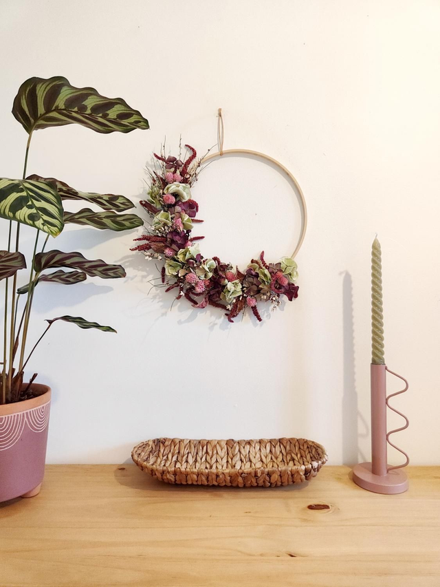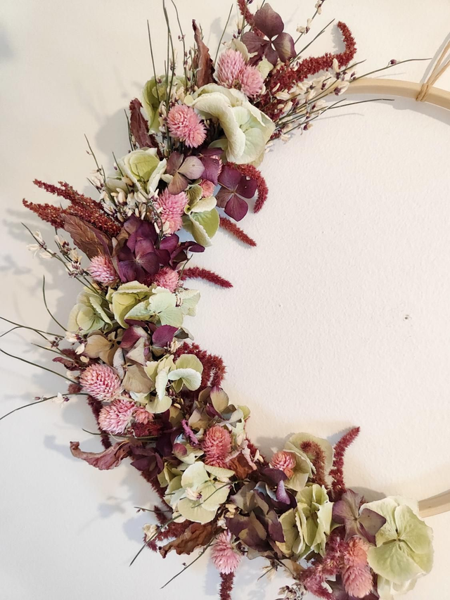 Adoptez Cassandre, la jolie couronne de fleurs séchées en demi-lune, soigneusement confectionnée à la main.