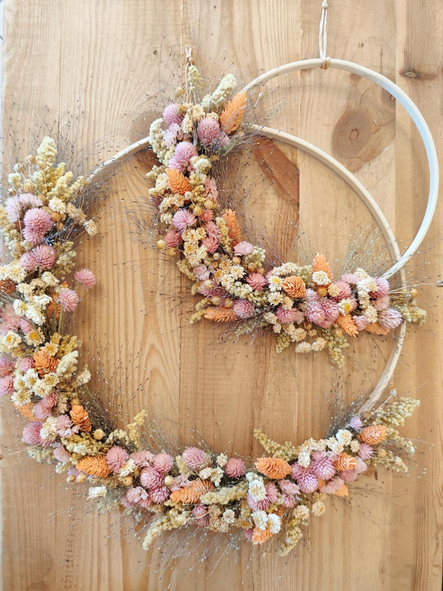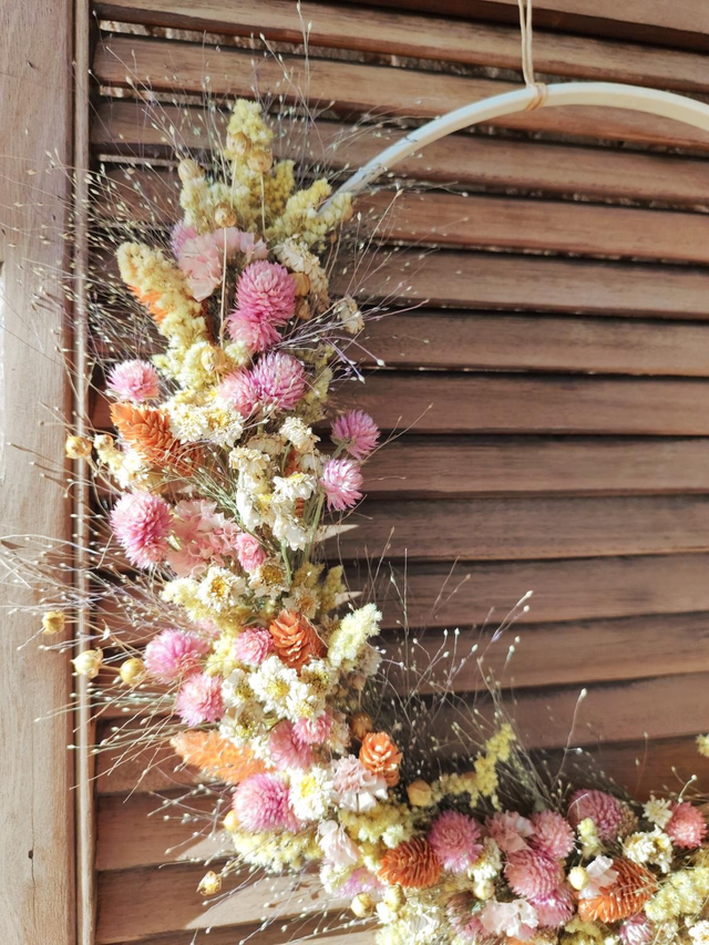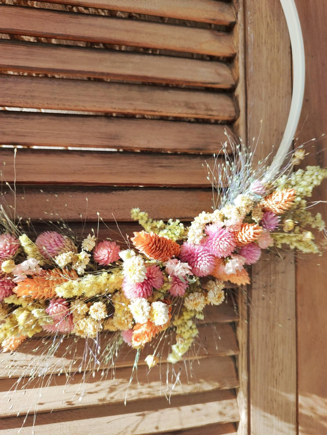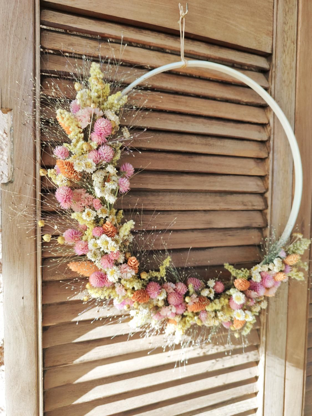 Adoptez Eloïse, la grande-sœur de Pauline, une jolie couronne de fleurs séchées en demi-lune : soigneusement confectionnée à la main, dans un esprit champêtre et pastel, sa forme lui confère une élégance aérienne. Les fleurs aux teintes harmonieuses de jaune pâle, rose tendre et orange abricoté offrent un mélange de couleurs délicat, parfait pour une ambiance bohème.