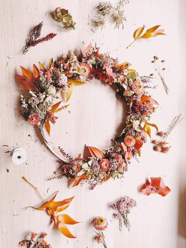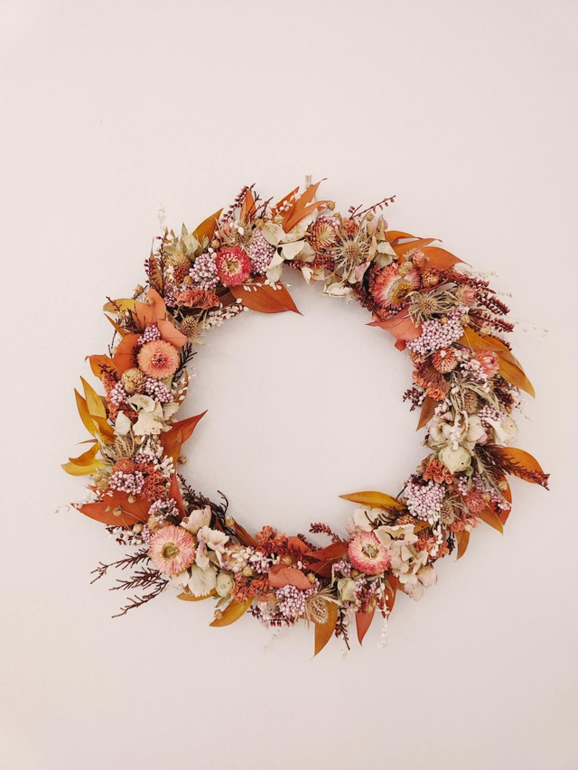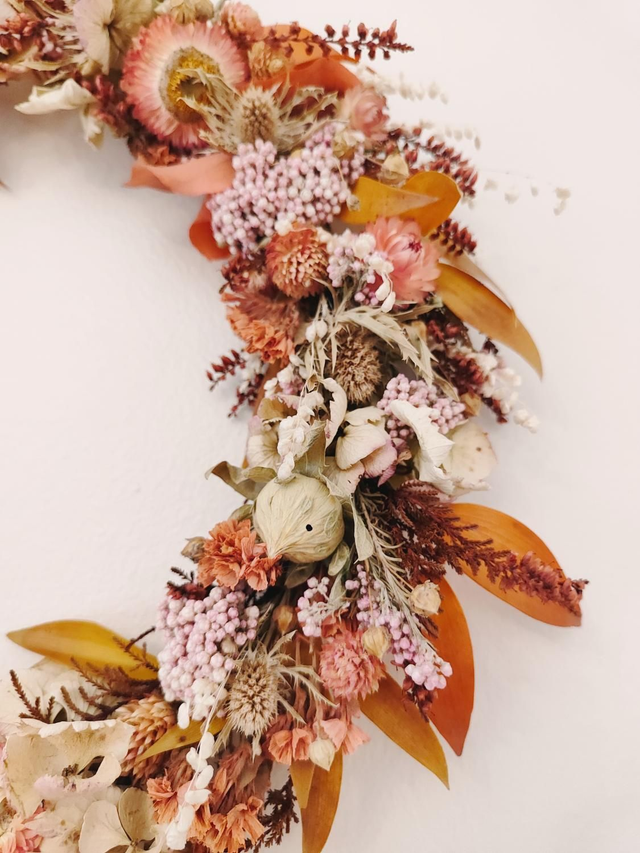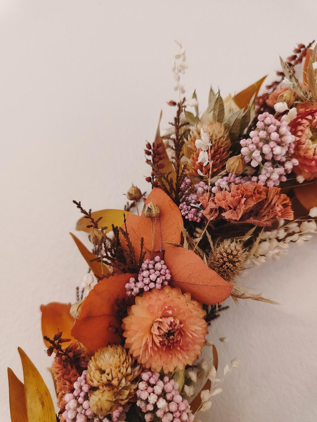 Gaïa est une création unique et délicate, confectionnée à la main avec une multitude de fleurs et feuillages séchés aux teintes automnales, soigneusement sélectionnées. Elle allie la douceur de touches rose pâle et beige à la chaleur de tons terracotta et ocre.