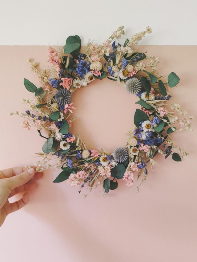 Parce qu'il n'y a pas que les couleurs chaudes dans la vie, cette couronne de fleurs séchées toute mignonne, réalisée à la main avec des fleurs choisies avec amour, ravira les fans de tons bleutés.