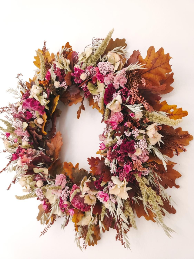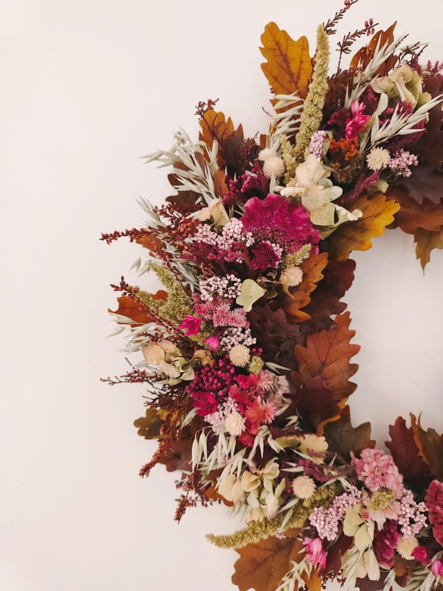 Morgane est une création unique et généreuse, confectionnée à la main avec une multitude de fleurs et feuillages séchées aux teintes automnales soigneusement sélectionnées. Elle allie des tons chauds et profonds tels que beige, caramel, terracotta, fuchsia, bordeaux, vert mousse et rose pâle.