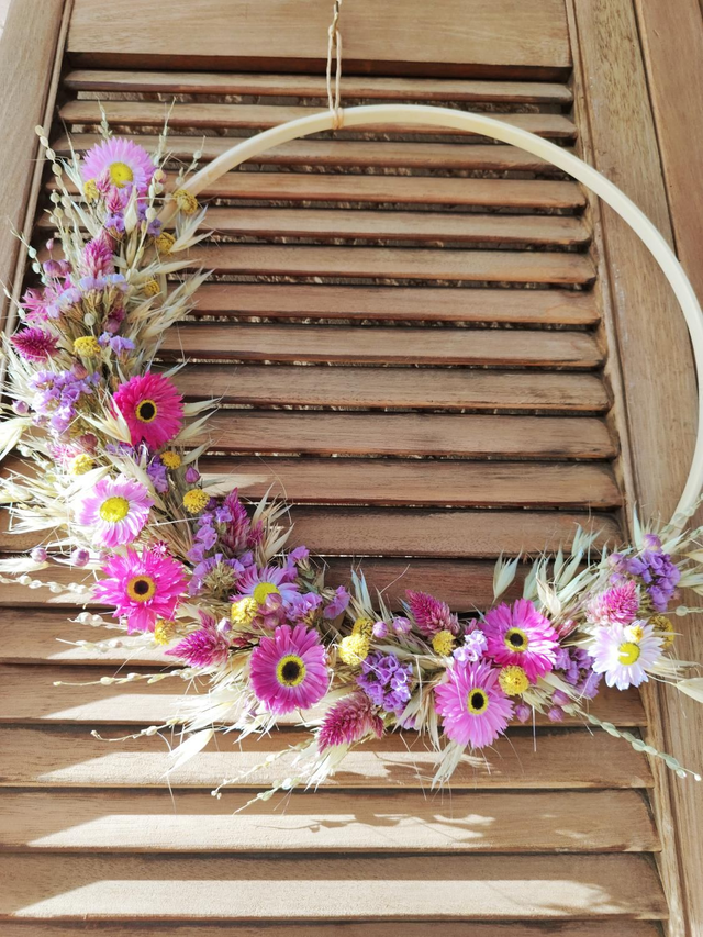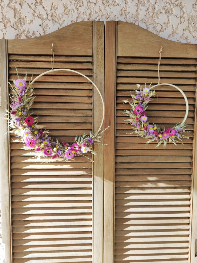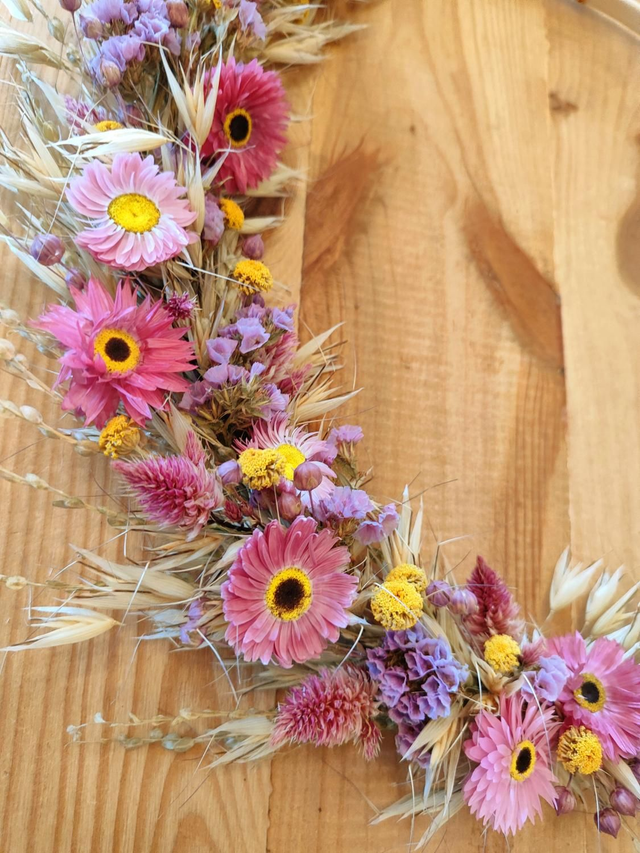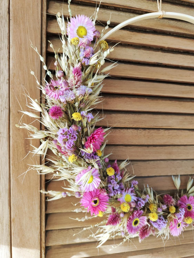 Adoptez Romy, la grande-soeur de Lou, une jolie couronne de fleurs séchées en demi-lune : soigneusement confectionnée à la main, dans un esprit champêtre et pétillant, sa forme lui confère une élégance aérienne. Les fleurs aux teintes harmonieuses de rose, parme et jaune offrent un mélange lumineux, parfait pour une ambiance bohème vitaminée.