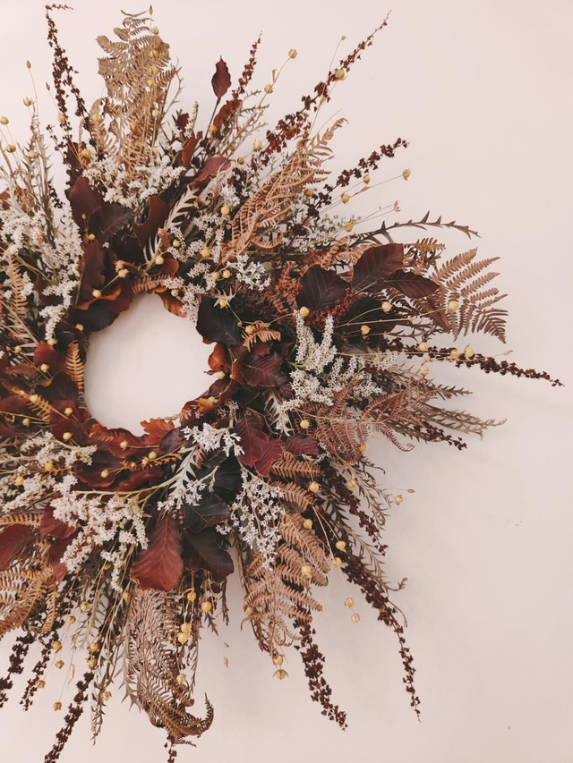 • végétaux utilisés : feuilles de hêtre stabilisées, fougère, grevillea, lin, limonium et oseille crépue séchés.