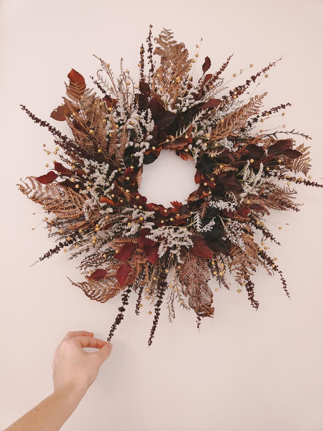 Tara est une création unique et majestueuse, confectionnée à la main avec une multitude de fleurs et feuillages séchés aux teintes automnales, soigneusement sélectionnés. Cette belle couronne allie des tons chauds tels que beige doré, caramel, mokka et bordeaux, au blanc lumineux du limonium.