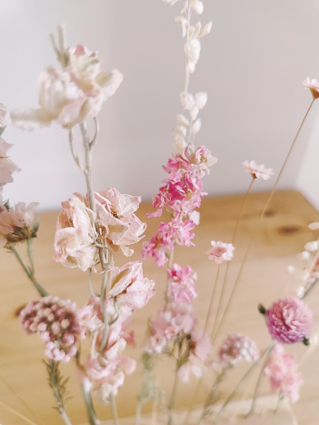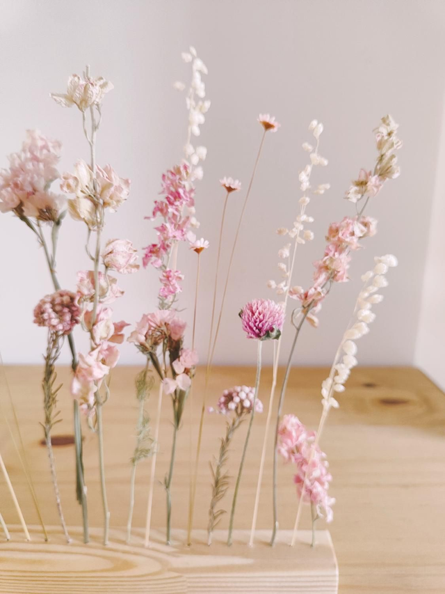 Un alignement aérien de fleurs séchées de 20cm de longueur, dressé sur un socle en bois naturel.