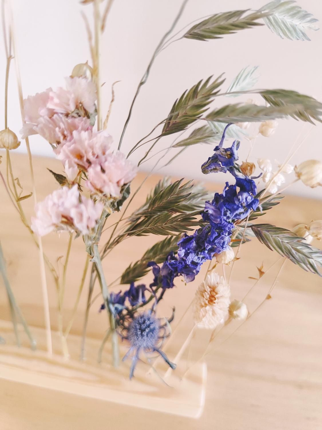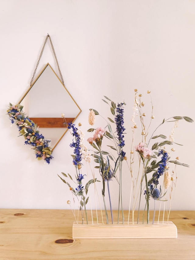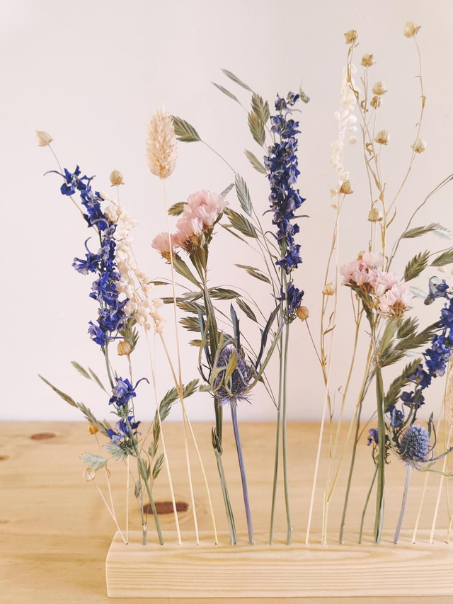 Un alignement aérien de fleurs séchées de 20cm de longueur, dressé sur un socle en bois naturel.