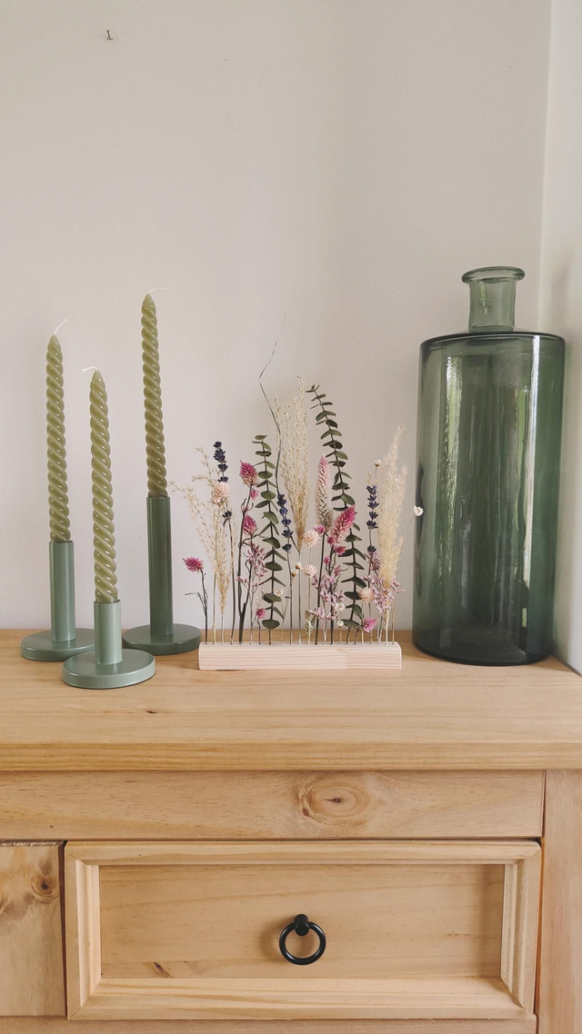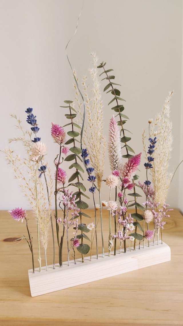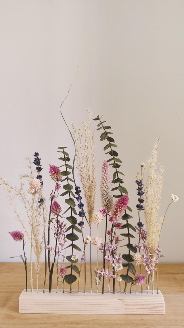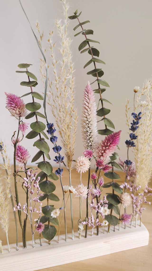 - Fleurs séchées naturelles : celosie plumosus, gomphrena, miscanthus, lavande, limonium, eucalyptus baby, glixia