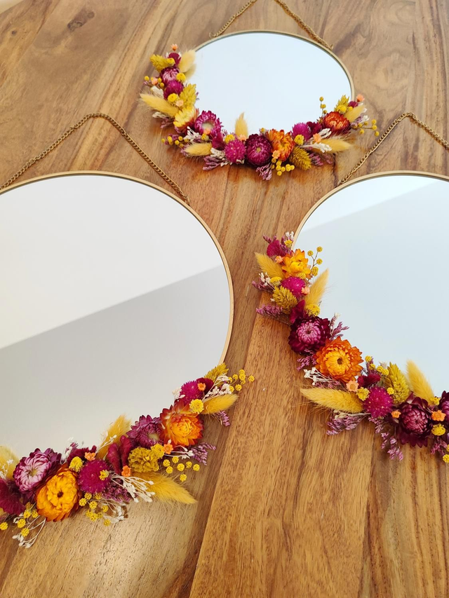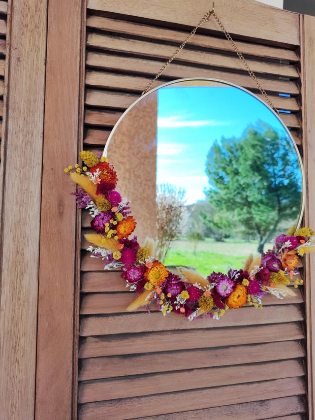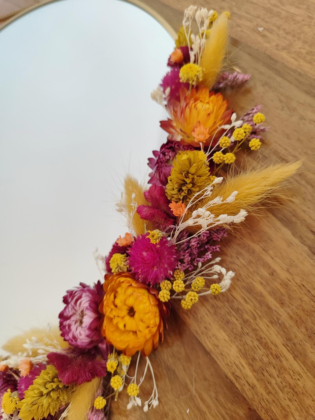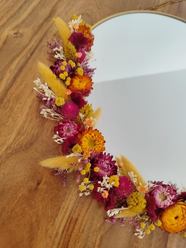 Vous cherchez LA touche qui fera pétiller votre déco ? Adoptez le miroir fleuri Frida, pimpé avec amour et orné de fleurs séchées vitaminées dans les tons jaune, orange et fuchsia. Le mix parfait bohème/peps !