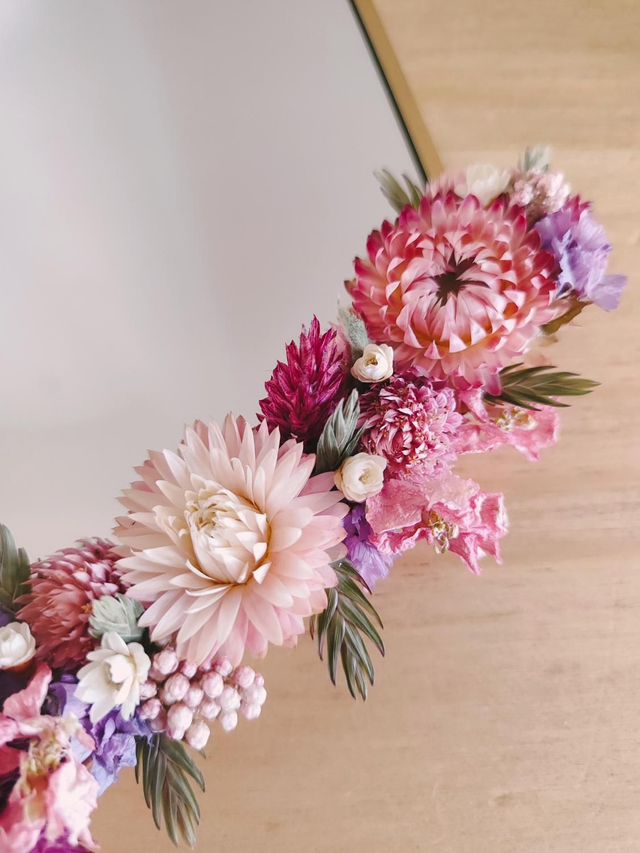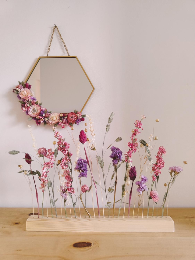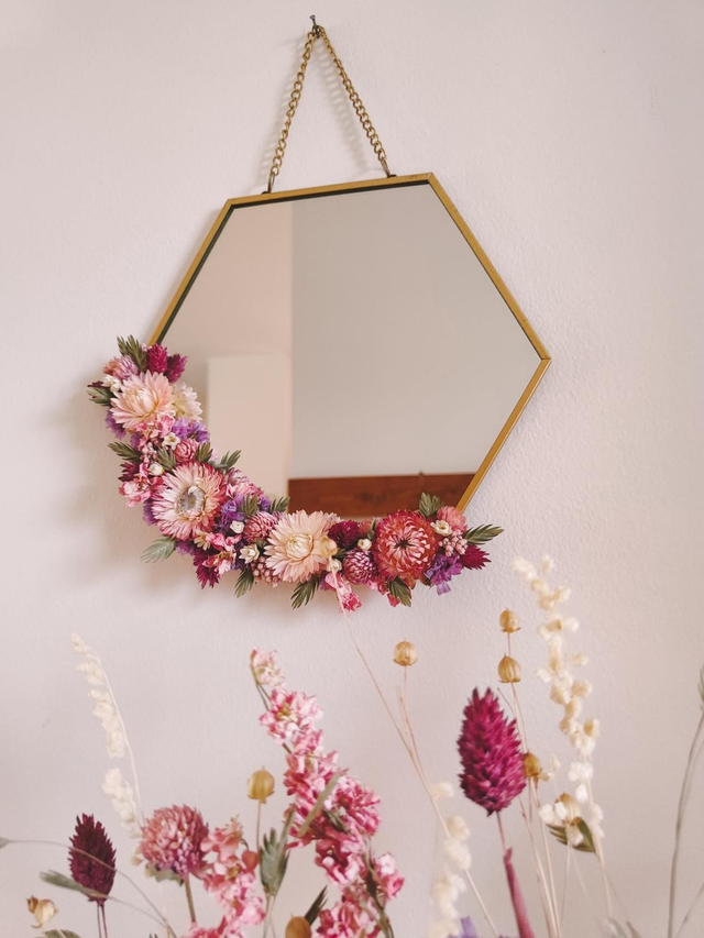Un adorable miroir hexagonal de 20cm de largeur, en verre et métal doré, habillé de fleurs séchées.