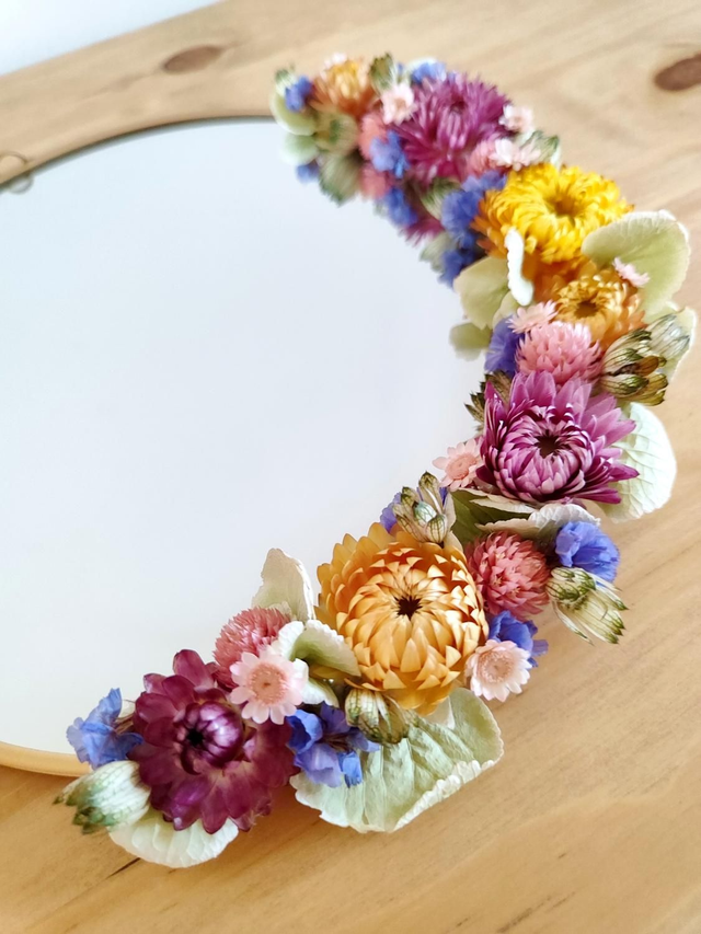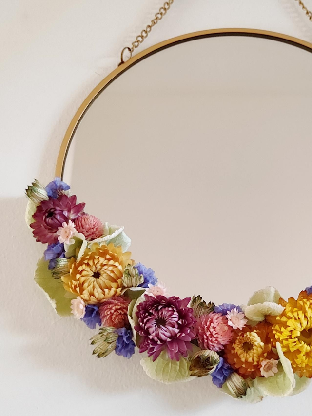 Adoptez le miroir fleuri Julie, pimpé avec amour et orné de fleurs séchées dans des tons pétillants et naturels.