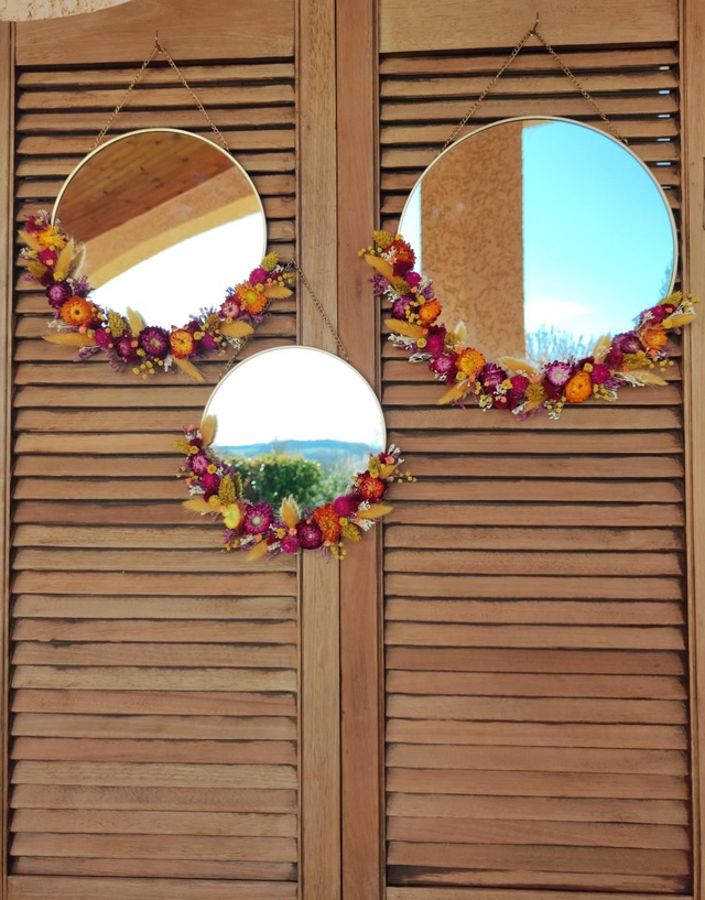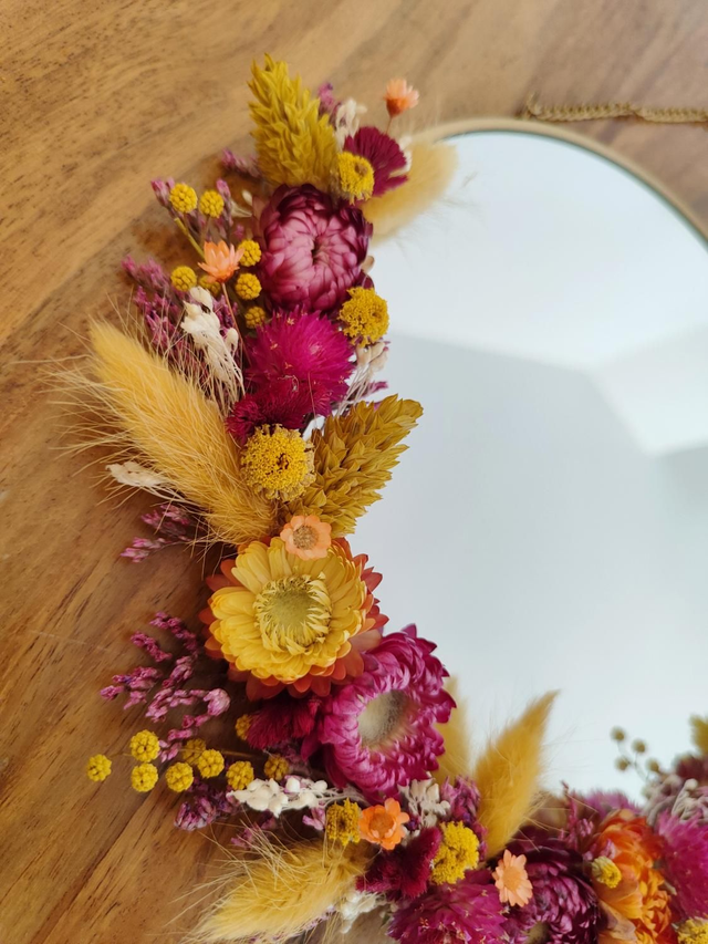 Vous cherchez LA touche qui fera pétiller votre déco ? Adoptez le miroir fleuri Mia, pimpé avec amour et orné de fleurs séchées vitaminées dans les tons jaune, orange et fuchsia. Le mix parfait bohème/peps !