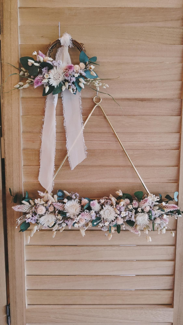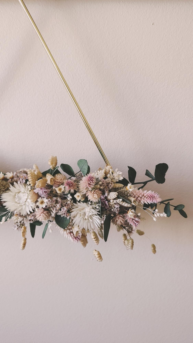 - Fleurs séchées naturelles : eucalyptus cinerea, immortelle, celosie plumosus, limonium, briza maxima, broom bloom, glixia